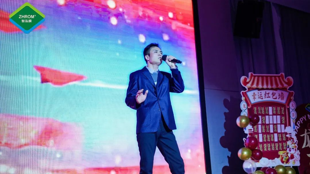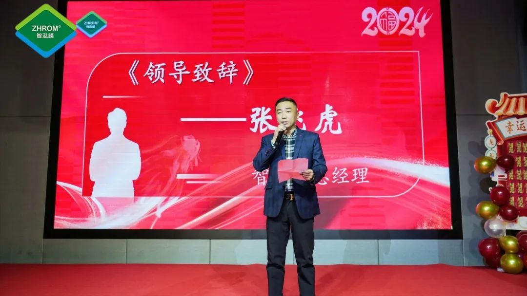 “春华秋实,硕果满枝。在过去的一年里,我们抓业务保增长,抓生产控质量,抓研发提效能,抓项目建设促工程进度,为公司平稳度过疫情的艰难时刻和业务持续发展提供了保障。”年会伊始,集团董事长熊治与总裁通过视频连线的方式向大家表达了新年的祝福,并表示,面对充满挑战的2023年,智泓净化以“全面价值领先”目标为引领,聚焦新变化、开拓新思维、应用新技术、抓住新机遇,智泓人无惧风雨、砥砺奋进,持续加强技术创新,积极响应国家倡导的节水环保理念,不断推出各类高品质的反渗透净水产品,满足市场及客户需求,持续领跑净水行业。随后,公司副总经理张飞虎在现场向大家致祝酒词。